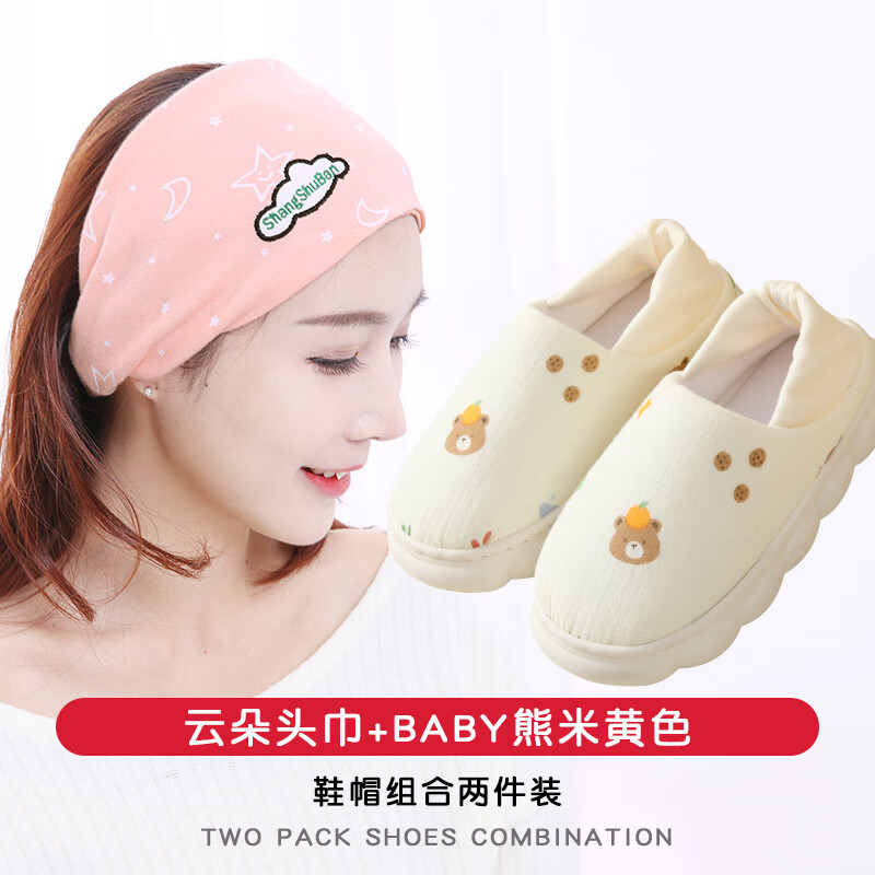 包邮 尚舒伴(SHANGSHUBAN)月子鞋帽产后秋冬薄款厚底春夏包跟孕妇软底产妇专用拖鞋外出防滑 【组合】云朵头巾+BABY熊米黄色 M(38-39)码