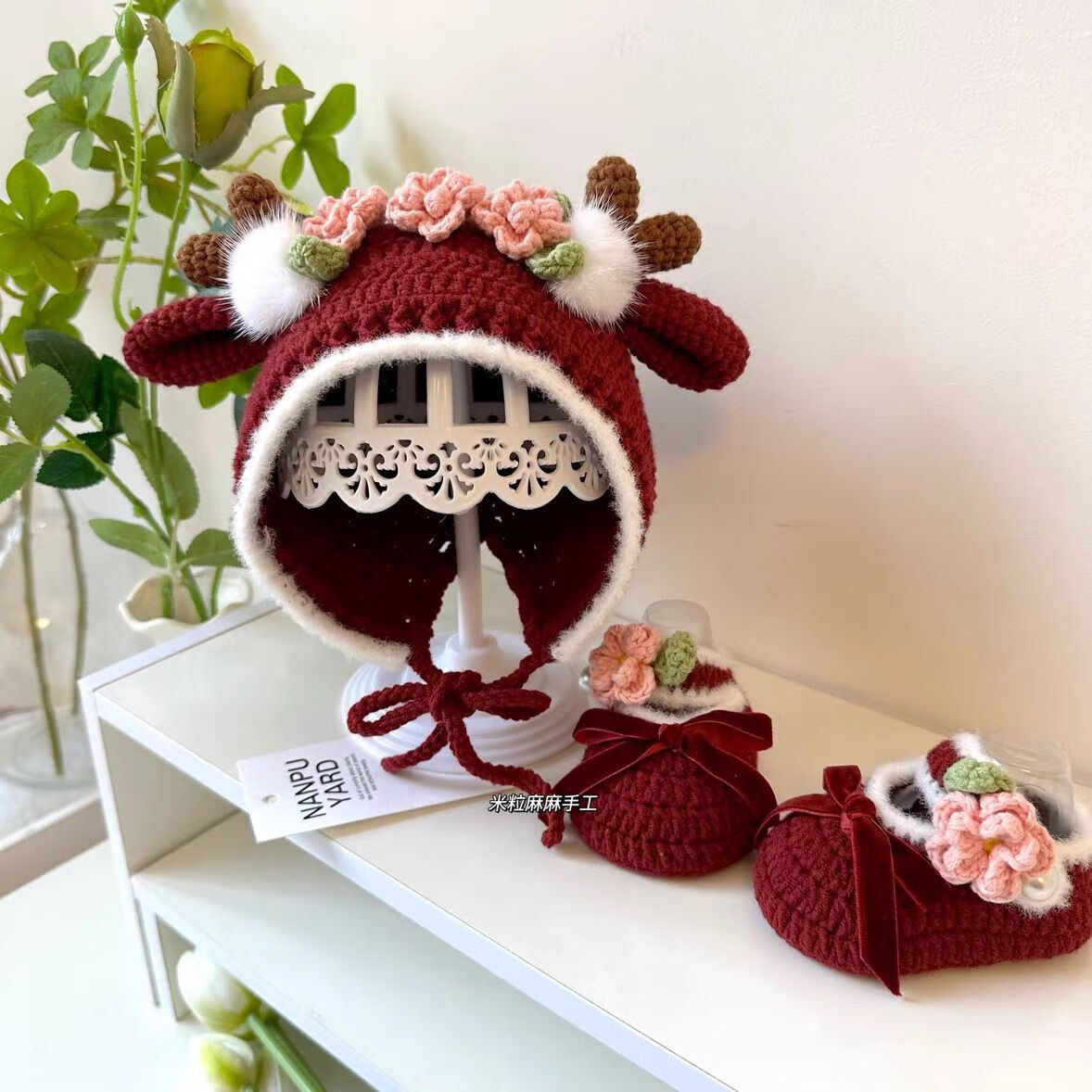 包邮 珞琳语宝宝帽子手工编织diy手工编织婴儿鞋帽麋鹿精灵DIY宝宝帽婴儿鞋钩 [酒红精灵]鞋帽材料包