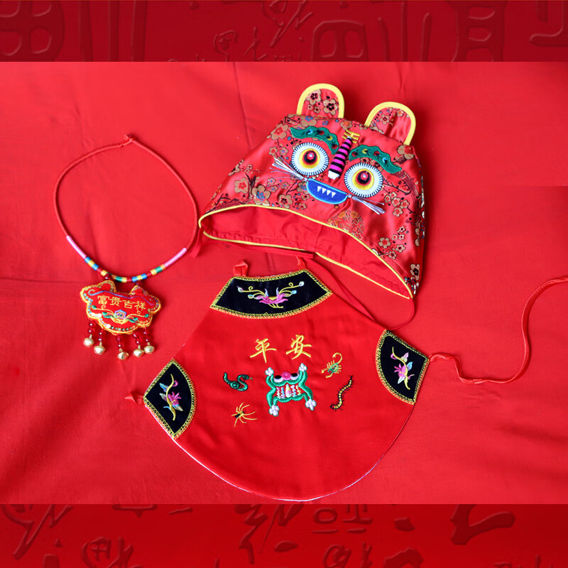 包邮 创京懿选虎头帽婴儿百天满月枕头肚兜百岁鞋子手工布老虎抓周套装老虎鞋帽 3件套 0-百天_均码