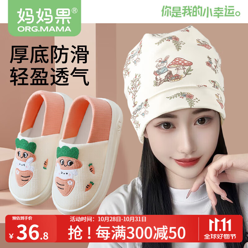 包邮 妈妈果(org.mama)月子鞋春秋冬月子帽秋季防风包跟孕妇拖鞋防滑厚底产妇月子发带 春秋【萌果兔兔】鞋帽套装A 鞋子尺码M(38-39)